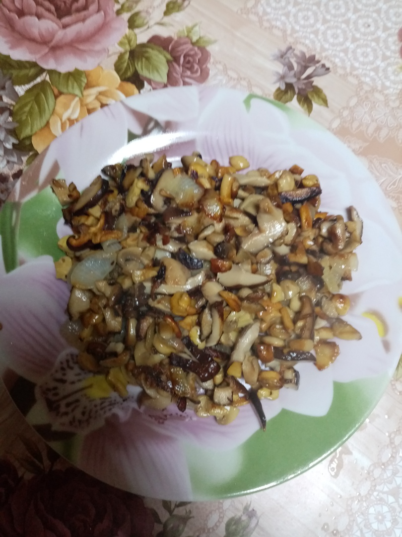 Приготовленные грибы нарезать. Как лук будет готов, закидываем грибы к луку. И готовим на среднем огне 15-20 минут, одновременно их помешивая.
