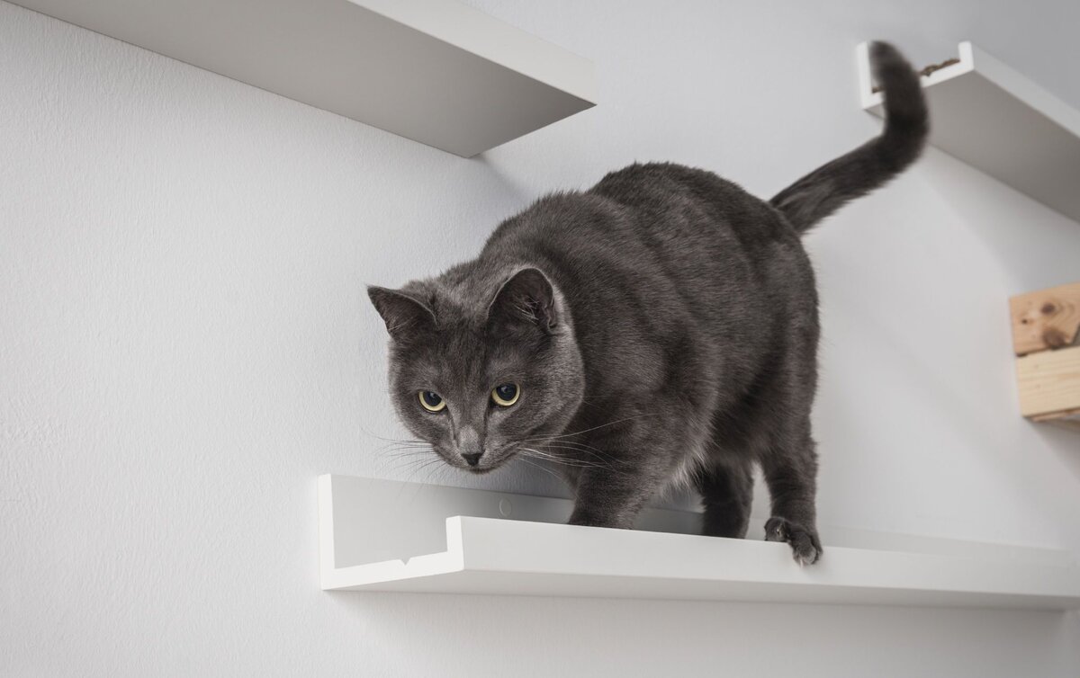 Превратите свою стену в игровую площадку для любимой кошки. Прикрепите карнизы разного размера на разной высоте и разной длины. Подрезать полки можно в ручную до необходимой длины и выровнить выступ наждачкой. А настенные кронштейны можно использовать, чтобы подвесить игрушки.