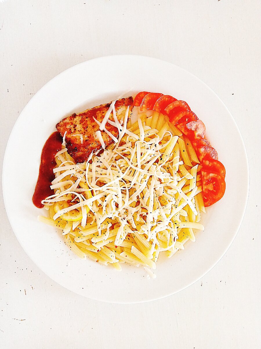 🔹 Сперва я замариновала мясо. Намазала его смесью из перцев, оливковым масло, сбрызнула лимоном и оставила минут на 15. После выкладываем мясо на разогретую сковороду, предварительно смазав сковороду маслом. Обжариваем минут по 5 с каждой стороны. Отвариваем макарошки. Выкладываем макароны, мясо, посыпаем сверху сыром и специями на свой вкус. Можно добавить помидорку, кетчуп и т.д.