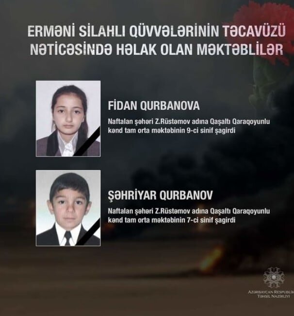 Двое азербайджанских школьников погибли в результате нападения вооруженных сил Армении ... Шахрияр Гурбанов, 2007 года рождения, и его двоюродная сестра Фидан Гурбанова, 2006 года рождения