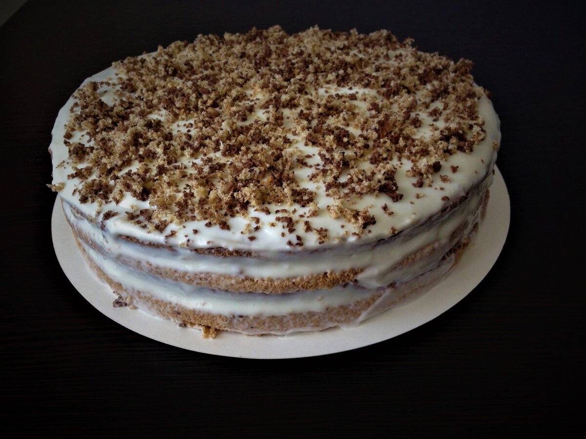 Готовые коржи обильно смазываем кремом, сверху торт по желанию можно украсить крошками от коржей, орешками, шоколадом.