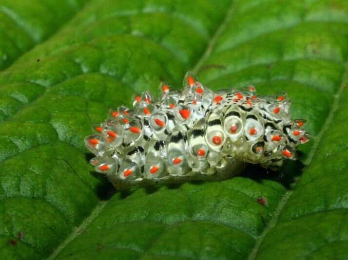 Природа не просто так делает этих гусениц мармеладными. Благодаря своим студенистым наростам они не боятся бесстрашно поедать листья на виду у своих врагов - птиц и других хищников.