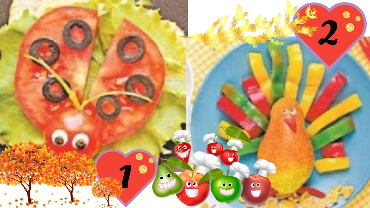 Для этого нам понадобится сладкая груша-разрежьте пополам вдоль (удалить семена т стопку), три разноцветных сладких перца-для перьев нарежьте толстой соломкой, из красного перца вырежьте клюв и лапки. Глаза — капельки сметаны и точечки из маслин. Наш яркий и очень полезный павлин готов. Но вы можете соорудить свою версию, использовав для яркого оперения кусочки огурца, помидора, редиса или моркови.