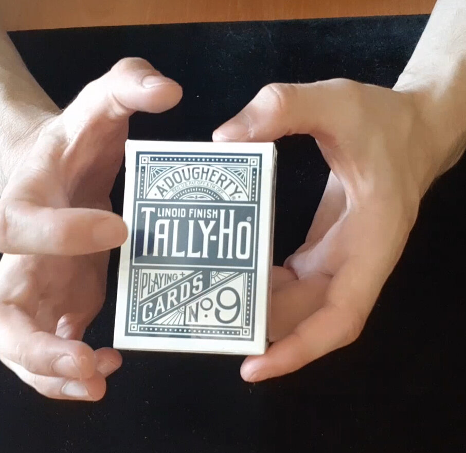 Давайте посмотрим на коробочку. Мы видим крупную надпись "Tally-Ho". Вообще, "Tally-Ho" - это некий возглас, крик, который переводится как "взять, поймать"! Этот крик присущ охотникам на лис, и колода, якобы, является колодой охотника на лис. Также мы видим надпись Linoid Finish. Linoid Finish - это покрытие карт, кстати, очень хорошее и качественное покрытие, которое позволяет картам очень долго держаться "в строю" и не изнашиваться. Я такой колодой, при интенсивных тренировках фокусов, пользовался порядка 3-4 месяцев, и они вполне пригодны для дальнейшего использования, но тем не менее немного все-таки износились. Далее видим надпись Playing Cards (игральные карты). №9 - честно сказать, не знаю что значит, наверное какой-нибудь 9 экземпляр или что-то типа того. Сверху красуется имя основателя колоды A. Dougherty (Эндрю Доджерти). Колода была основана в 1885 году, кстати, одновременно со знаменитыми Bicycle Standard. Ну и различные узоры, линии вы можете рассмотреть на фото.