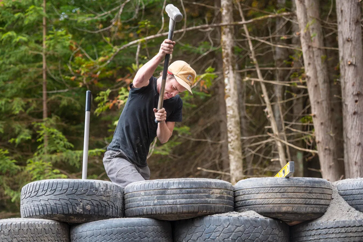 Рабочие запихивают картон в основание каждой шины и заполняют пространство грязью, а затем кувалдами и лопатами уплотняют материал. Резиновый каркас конструкции в форме подковы уже достиг девяти шин в высоту.
