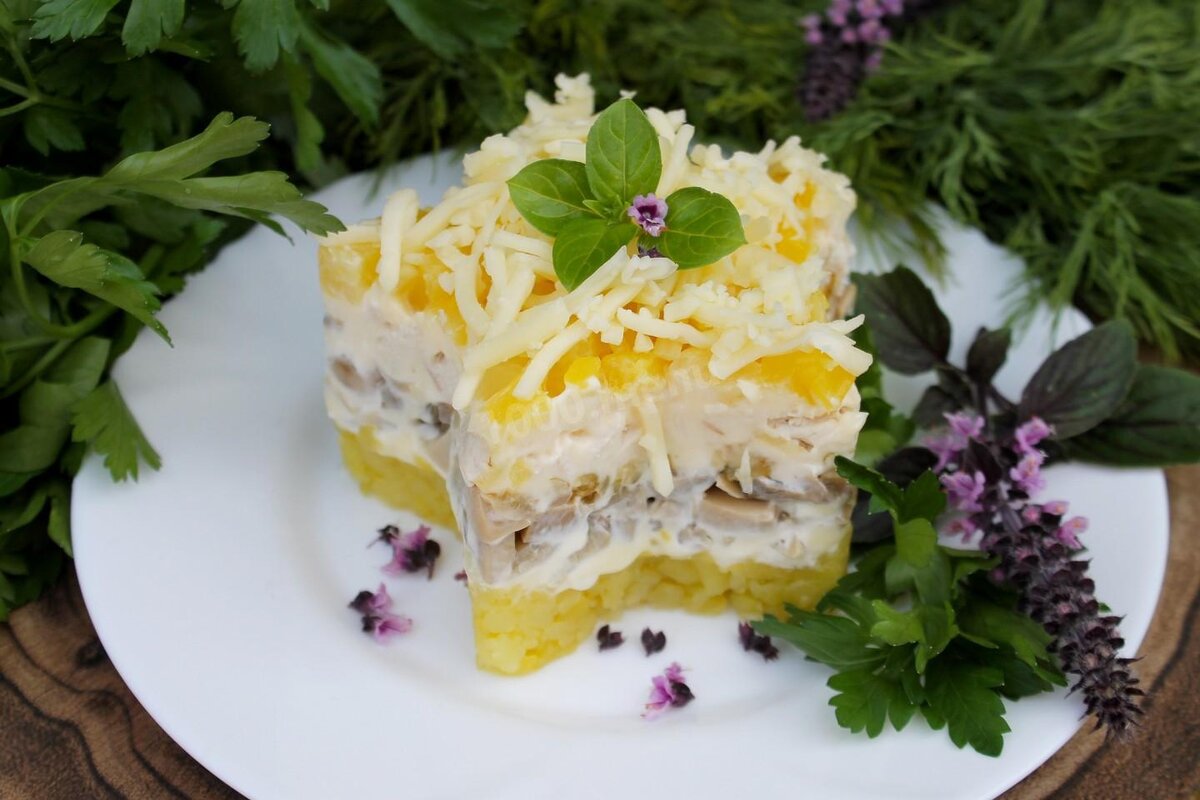 Следующим слоем сделайте шампиньоны и обжаренный лук. Снова смажьте майонезом.