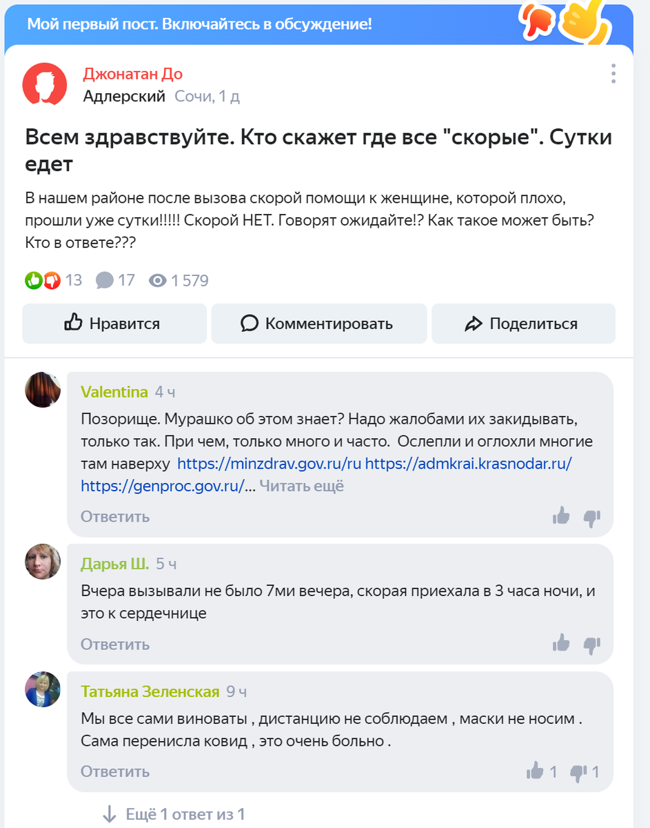 Сижу смотрю что пишут у нас на районе, и о чудеса, девушка вызвала скороую, а они тупо не едут.