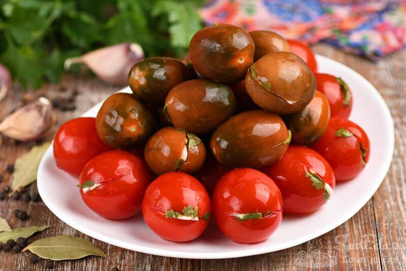1 ст.л. сахар Инструкции 1. В кастрюлю или ковш наливаем 1 литр воды, добавляем соль, сахар, лавровый лист, молотый перец, перец горошком и доводим до кипения. Затем вливаем уксус, снимаем с плиты и охлаждаем. 2. Закуска получается вкусная и выглядит очень красиво, если использовать небольшие помидоры. Ее можно готовить круглый год. И с домашними помидорами, и с купленными в магазине она получается вкусной. У меня час
