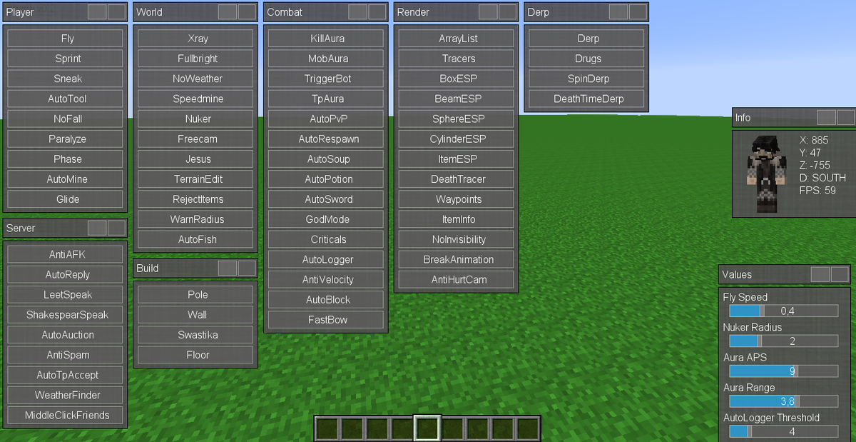Привет! В этой статье я расскажу о 3 лучших чит клиентах (по моему мнению). Я давно играю в Майнкрафт и о читах тоже давно знаю. Сам я любитель ванилы но тем не менее я это попробовал. Ну что же, к сути. 1. Impact - чит клиент. В нем есть почти все. Основные читы: Killaura, Velocity (anti knokbeck), no fall, hitbox и т.д. На первом месте потому что чит клиент очень хорош по дизайну и почти не портит ваш FPS. 2. Sigma 5.0 - чит клиент. В нем есть почти все что и у Impact но дизайн на много лучше. (По моему мнению слишком распиаренный чит клиент). 3. Salhack - довольно таки новый чит. Сам я с ним мало поиграл но результат шокирует. Без лагов. Хороший дизайн. Не кикает на многих серверах. Ну а на этом всё. Ждите новых статей :)