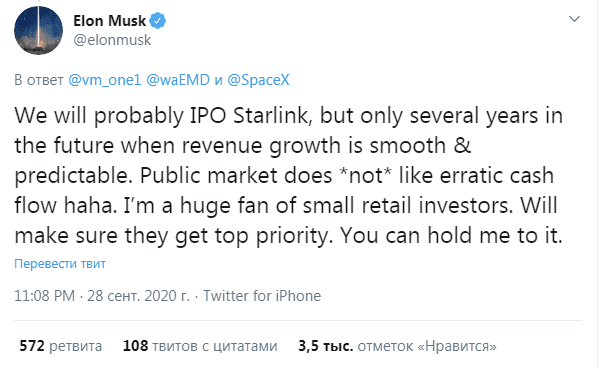 Илон Маск: "Возможно, мы проведём IPO Starlink, но только через несколько лет, когда рост доходов будет плавным и предсказуемым. Публичный рынок не любит неустойчивый денежный поток, ха-ха. Я большой поклонник мелких розничных инвесторов. Убедимся, что они получат высший приоритет..."