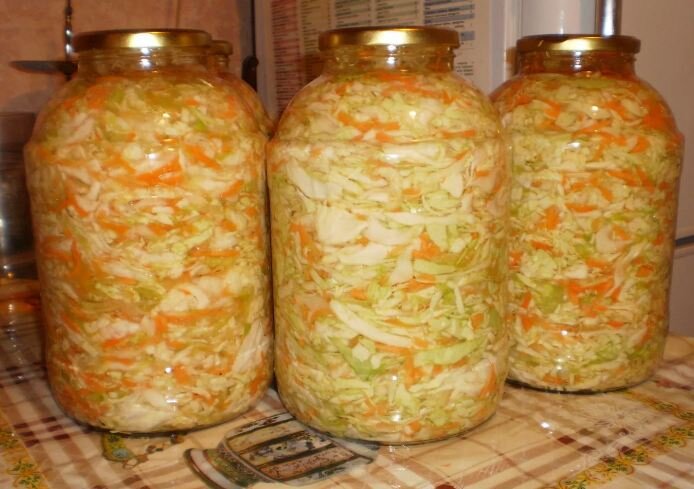 И снова у нас дела капустные. Время заготовок квашеной капусты настало и значит вся кухня заставленная бачками да кастрюлями с капустой. Больше 50-ти способов квашения капусты существует в мире. Надо применить и опробовать хотя бы половину. Очень понравилось квасить капусту в трехлитровой банке. Получается не хуже эмалированного ведра или кастрюли, только удобнее и меньше места занимает. А также чисто и аккуратно. И капуста выходит беленькая, хрустящая и ароматная. Ингредиенты: 2-2,5 кг капусты 2 моркови 2 л воды 3 с. л. соли 2 ст. л. сахара 1 ч. л. специй или приправ (смеси перцев горошком, пряные травы, семена укропа или кориандра) Как готовить: 1. Снять с кочана капусты верхние листья, разрезать его пополам и затем нарубить или нашинковать как вам удобнее. Для этого квашения можно использовать специальный нож шинковку, чтобы сделать из капусты красивую и длинную стружку. 2. Почистить морковь и натереть на крупной терке. Смешать морковь с капустой. 3. В чистую и простерилизованную ба