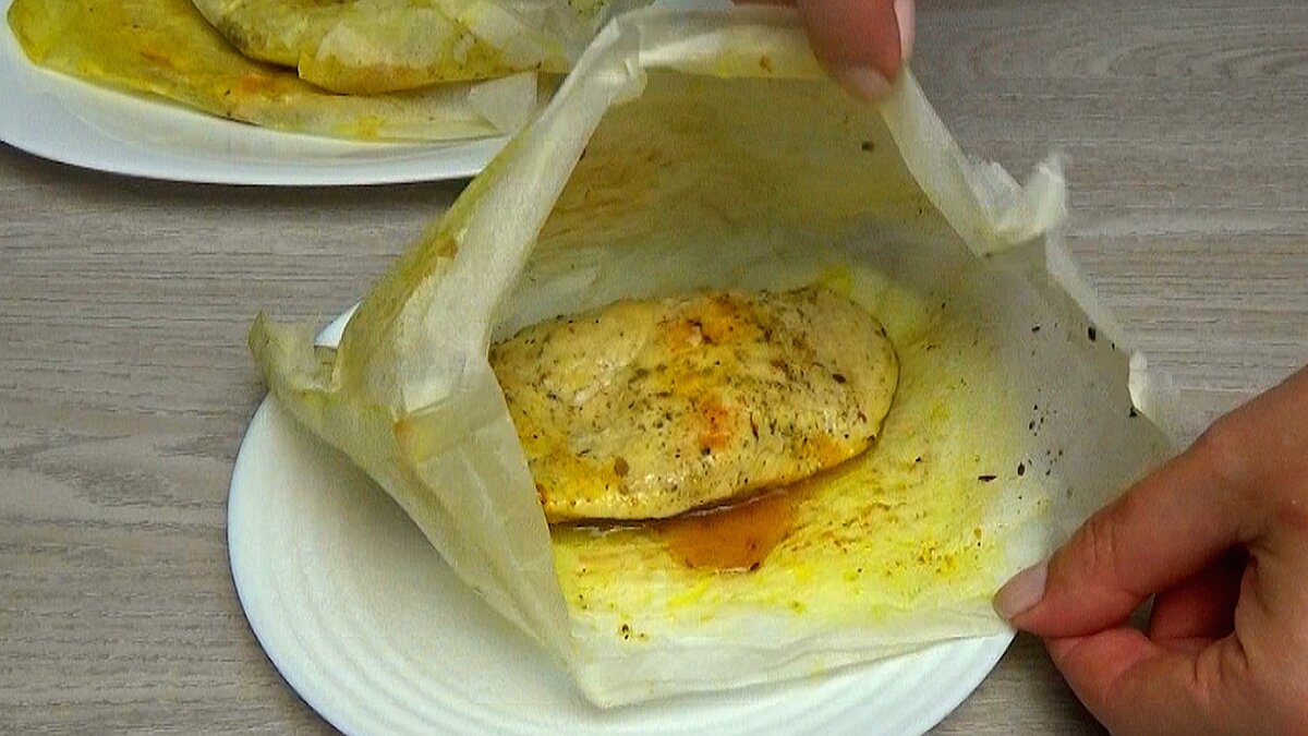 - На одну часть пергамента выкладываем филе и накрываем другой частью листа