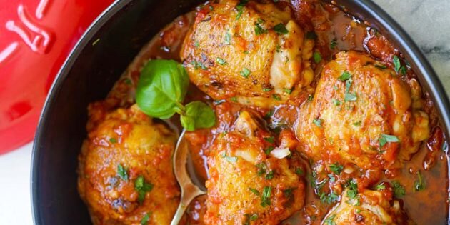 За 5 минут до готовности курицы убираем крышку, добавляем подготовленный перец. Тушим без крышки, даём соусу немного выпариться.