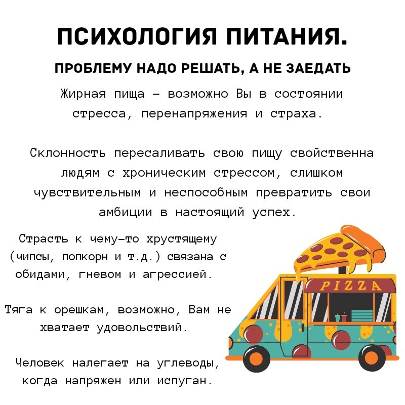 Человек налегает на углеводы, когда напряжен или испуган. В этом состоянии в организме увеличивается количество кортизола, благодаря которому производится еще одно вещество под названием нейропептида Y. На пару они «решают», что тело в опасности, что ему срочно нужно запастись жирами впрок, а, значит, нужно захотеть пиццы и пасты.