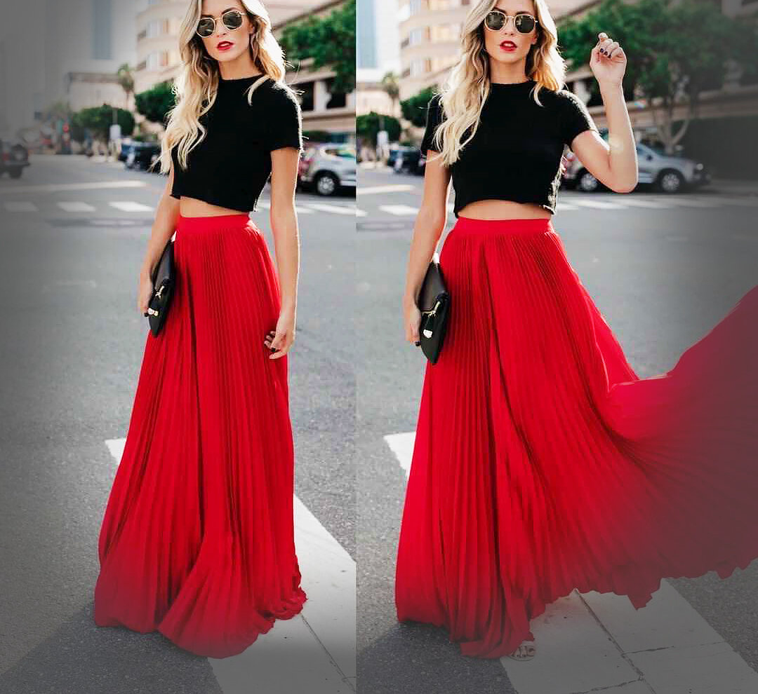 Очень популярно сейчас сочетание юбки-макси и короткого топа. В таком образе очень хорошо прогуливаться в жаркую летнюю погоду. Подбирать можно однотонные топы и модели с рисунками, узорами. Цвет верха можно также варьировать. Очень стильным считается комбинация вещей разного цвета.