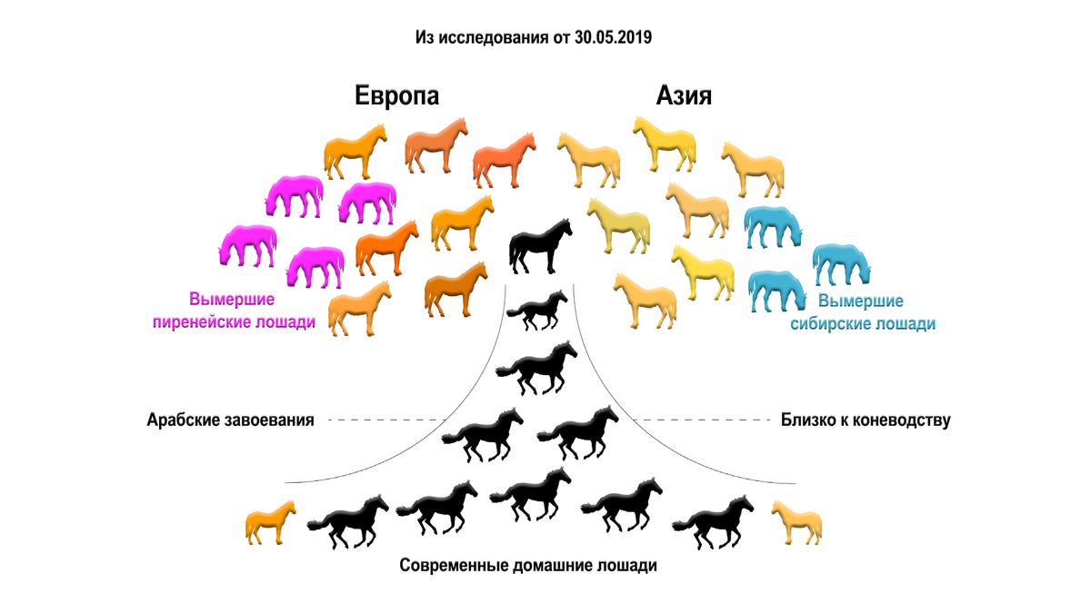 Параллельно с этим, разнообразие материнских линий у лошадей Кавказа и Анатолии заметно возросло от 2 до 14, т.е. уровня современных, а также лошадей эпохи энеолита, халколита и ранней бронзы из Юго-Восточной Европы и Казахстана.