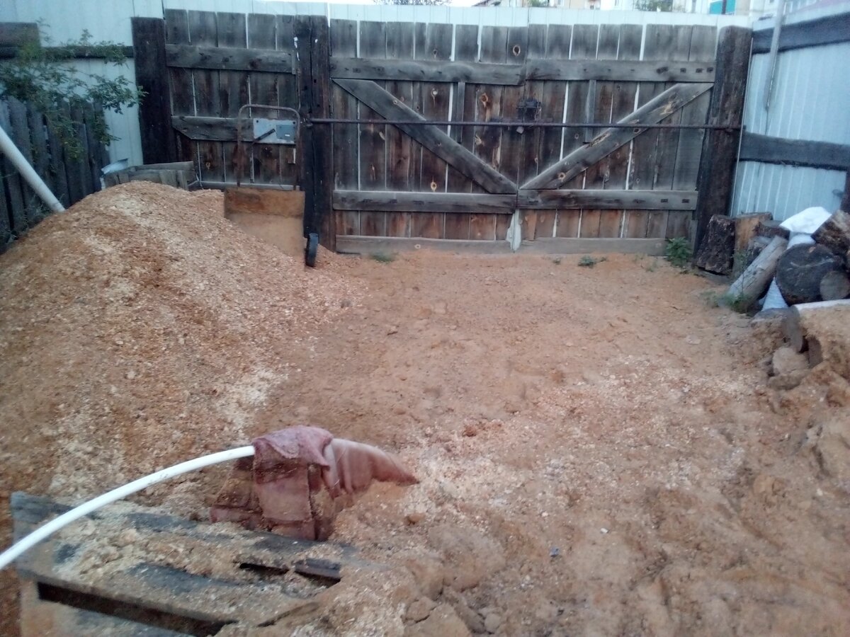 Потом песок частично выкидал на дорогу за ворота, частично у меня его забрали. И в итоге труба скважины снова показалась над землей. И до наступления холодов надо было обязательно с ней что-то делать, потому что нужно примерно на это место планировалось скоро выгрузить дрова.