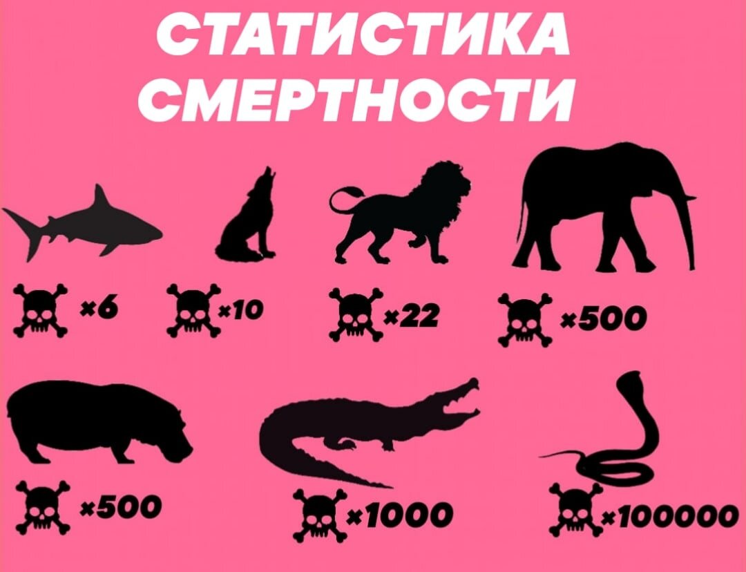 13 советов которые нужно знать чтобы пережить нападение диких животных многие дикие животные могут быть опасны или даже смертоносную для человек если взгляните на статистику она может вас ужаснуть акулы провоцирует всего шесть смертей в год их незавидная репутация сильно преувеличена.волки ответственны за 10 смертей в год.львы убивают 22 человека в год. теперь приготовьтесь слоны милые гиганты являются причиной смерти более 500 человек каждый год гиппопотамы сравняли с ними в этом страшном соревновании,крокодил оказались куда более опасными чем акула около 1000 смертей в год,но чемпионы здесь змеи 100000 человек находят смерть в клыках этих рептилий