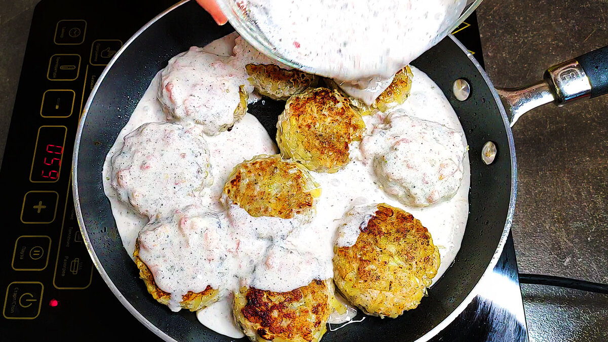 базалаик - 0.5 ч.л ПОШАГОВЫЙ РЕЦЕПТ ПРИГОТОВЛЕНИЯ На крупной терке натираем картошку, лук, добавляем фарш, всыпаем соль, перец, сушеный чеснок, прованские травы, перемешать. Из полученной массы лепим котлеты и перекладываем на блюдо. Подпишитесь на мой канал Ольга Лунгу На разогретую сковородку наливаем растительное масло, выкладываем заготовки и на среднем огне жарим с двух сторон до золотистого цвета. Готовые картофельные котлеты перекладываем на блюдо, подготовим заливку. На крупной терке натираем помидор, добавляем сметану, вливаем воду, всыпаем перец и базалик, перемешать. На сков