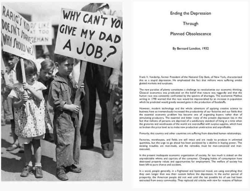 Само понятие «запланированное устаревание» появляется в 1932 году. Американский риелтор Бернард Лондон публикует памфлет «Выход из Великой Депрессии с помощью запланированного устаревания».