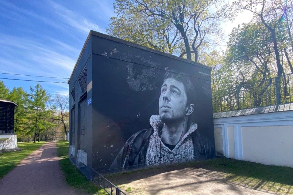 Еще одна культовая личность 90-х нарисована в культурной столице России. Портрет размещен на стене трансформаторной подстанции, где уместилась также строчка из одной его композиции.
