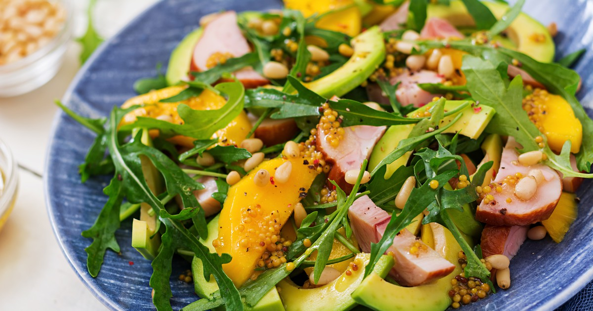 В глубокой салатнице дно выстелите листьями рукколы, выложите все измельченные ингредиенты – мясо и плоды. Полейте заправкой и хорошо перемешайте щипцами.