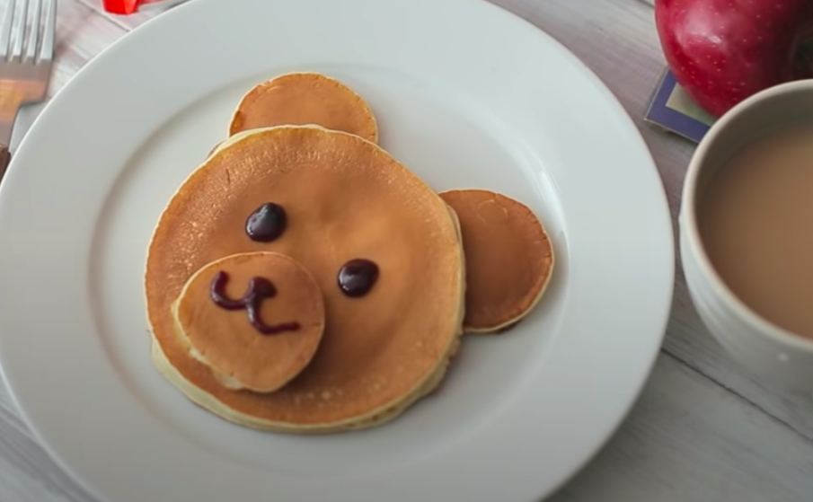 Готовим обычное тесто для блинов (оладушек) и жарим на сковороде без масла блины разного размера – для мордочки, ушек и носа. А затем украшаем джемом, дорисовывая части мордочки. А если подадите с чаем и медом, то получиться прям целая сюжетная линия.