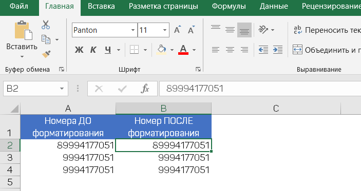 MS Excel имеет множество форматов, в которых можно представить ваши данные. Что делать, когда стандартный формат не подходит? Ответ прост — создайте свой. В этой статье разберем формат Номер телефона. Исходные данные: Для настройки формата Номер телефона, нажмите Ctrl+1, чтобы открыть окно Формат ячеек и выберите вариант Дополнительный: По умолчанию Номер телефона имеет не подходящий для нас формат. Давайте это исправим. Нажмите (все форматы) и исправьте Тип на [<=9999999]###-####;# (###) ###-##-##: Формат будет изменен: Для дальнейшего изменения формата в ячейке, вам придётся каждый раз заходить в Формат ячеек ► (все форматы) и искать нужный, что не очень удобно, согласитесь. Сохранить время помогут макросы. Преобразует телефонный номер 8хххххххххх в формат 8 (ххх) ххх-хх-хх: Sub Phone8Format() 'Установка формата тел.номера с 8 для 11 цифр On Error Resume Next If TypeName(Selection) <> "Range" Then Exit Sub Selection.NumberFormat = "# (###) ###-##-##" End Sub Преобразуе