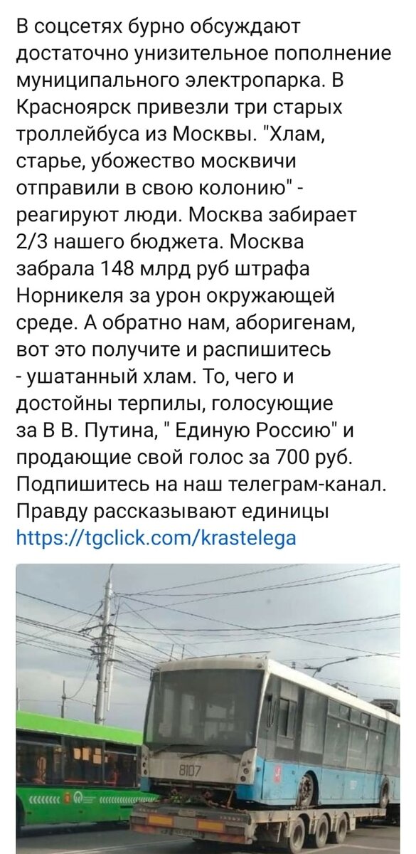 В Москве сняли с линии все троллейбусы и отправили их на автокладбище, как устаревший вид транспорта. Вместо них по линии запустили новые Электробусы. Затем взяли троллейбусы с помойки и отправили в Красноярск. Обновили так сказать автопарк. Красноярцы восприняли это как оскорбление и я согласен. Да, это оскорбление.