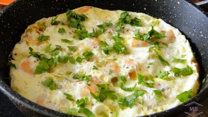 Ингредиенты: 200 грамм креветок, 1 небольшой стебель лука-порей, 1-2 столовые ложки растительного масла, 4 яйца, 100 мл молока, соль и перец — по вкусу, зелень — по вкусу.