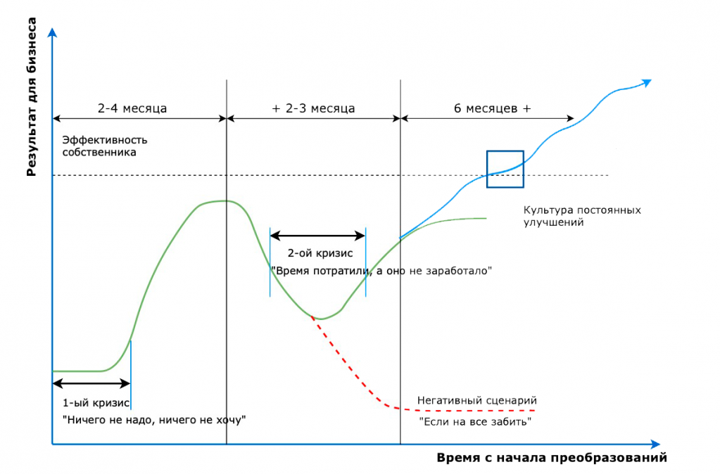 В целом, в команде начинают появляться настроения — «время потратили, а оно не заработало». Есть несколько вариантов, почему возникает кризис внедрения: