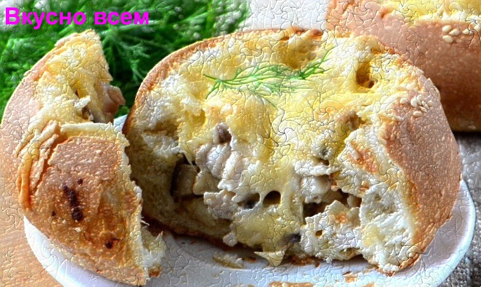 Этот рецепт для меня просто находка. Во-первых, не нужно пачкать лишнюю посуду, эта закуска подается порционно каждому, а во-вторых это полноценное блюдо, где есть и курица, и грибочки, и сыр, и хрустящая булочка.