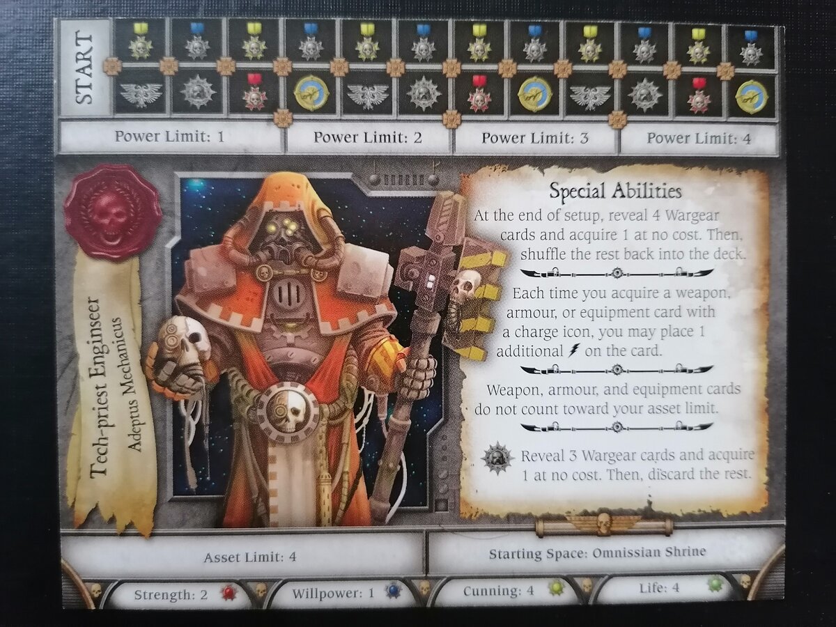 В начале игры получает бесплатно 1 карту Снаряжения на выбор из 4-х.