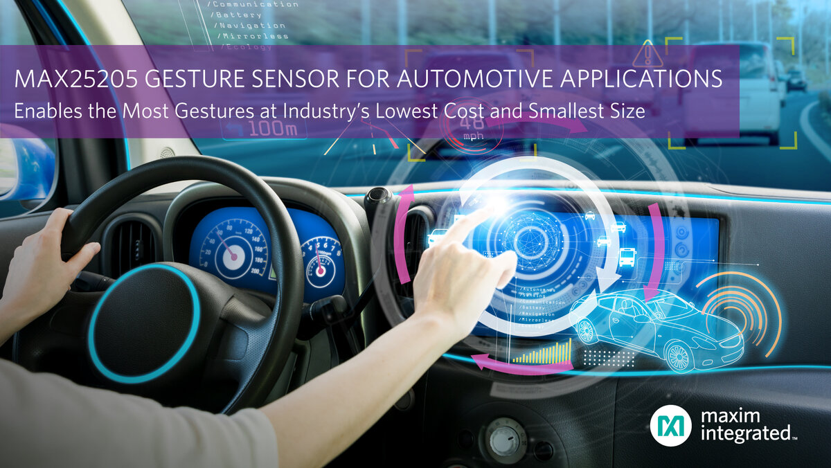 Разработчики автомобильных систем теперь могут добавлять элементы управления динамическими жестами рук с датчиками, объединяющими ИК-массив. Maxim Integrated выпустила новый продукт MAX25205, который объединяет оптику и инфракрасный (ИК) датчик 6x10 для обнаружения жестов смахивания и поворота руки без использования камер. В зависимости от технологии датчик может быть меньше по размеру и стоить