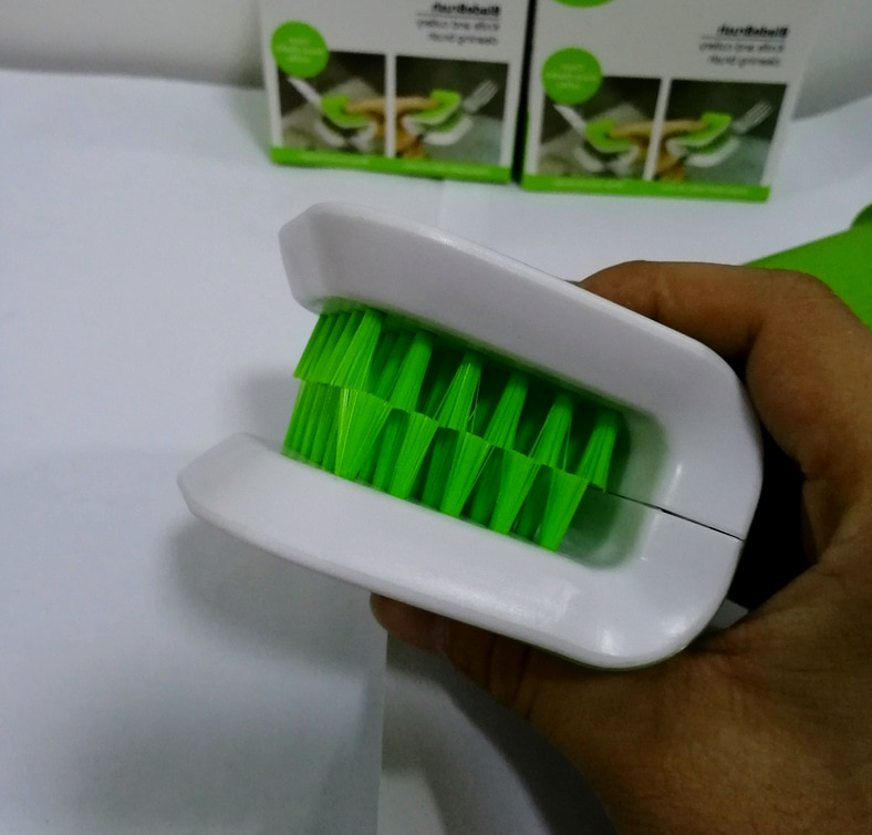 Абсолютное большинство из нас уже привыкло мыть столовые приборы и ножи поролоновой губкой. и при небольших загрязнениях это зачастую оказывается достаточно эффективно. Но для более быстрой и безопасной очистки можно использовать вот такую U-образную щётку, которая немного напоминает челюсть с зубами. Т.к. может полностью раскрываться и силу прижима её щетинок друг к другу можно менять при помощи сжатия пальцев.