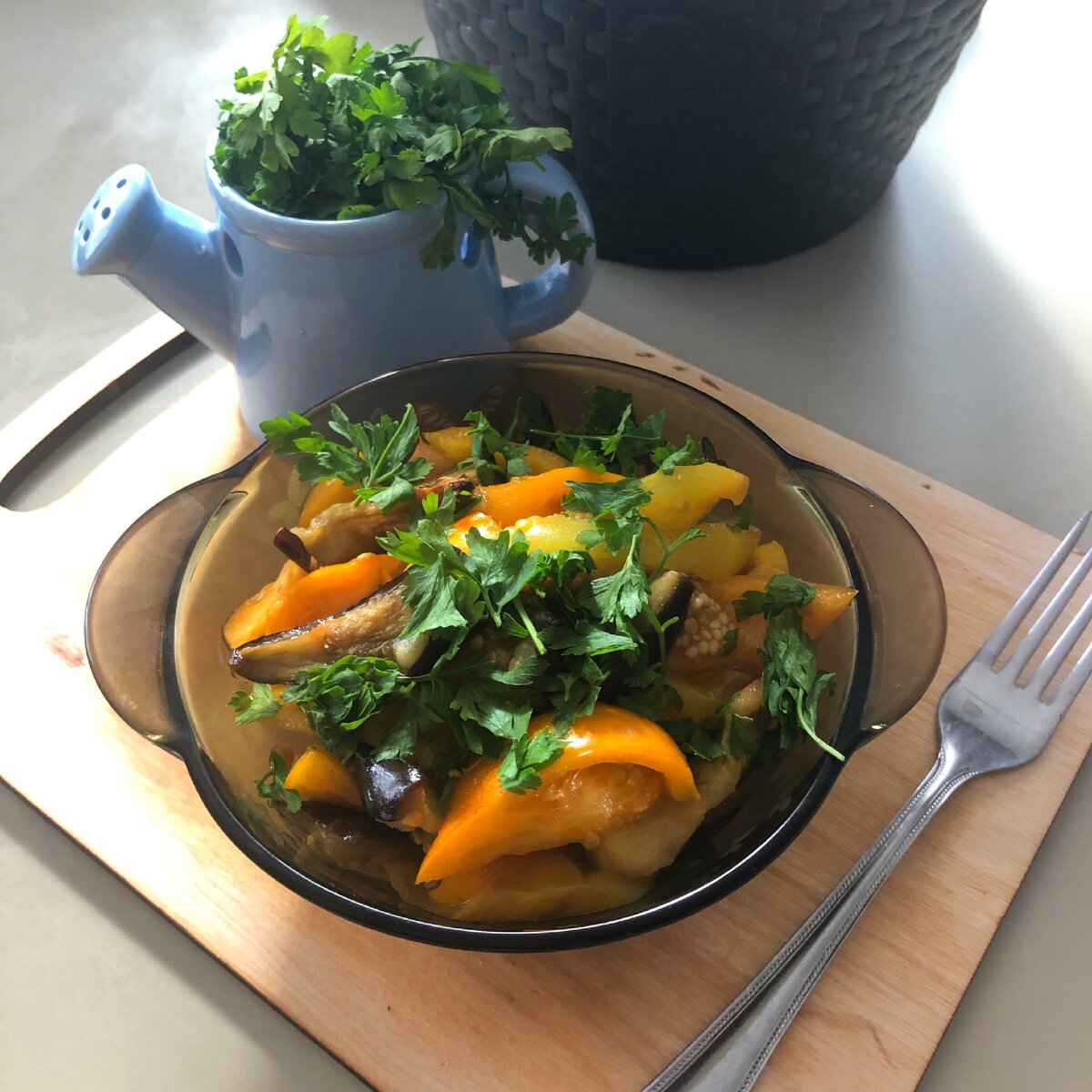 Ингредиенты: Баклажаны Перец болгарский Помидоры Соевый соус Горчица Мёд Перец красный молотый или острый чили. Приготовление: Баклажаны режем брусочками,перец соломкой,в идеале,баклажаны и перец должны быть одинаковые по длине,так будет гораздо красивее. Перемешать баклажаны и перец, сбрызнуть растительным маслом. Лист застелить пекарской бумагой,выложить на него овощи,отправить в духовку на 200 градусов на 15-20 минут.Чтобы овощи запеклись,но не зажарились. Тем временем режем длинными дольками помидоры,добавляем к ним овощи из духовки и заправляем соусом: смешиваем соевый соус,мёд,горчицу в пропорции 3:1:1, хорошенько перемешиваем и отправляем в салат. Сверху посыпаем немного приправой острого красного перца или добавить мелкопорезаный свежий острый перчик. Кстати,соль я не добавляю,в соевом соусе её достаточно,но если вам недостаточно,немного подсыпьте. Приятного аппетита Вам и Вашим близким!