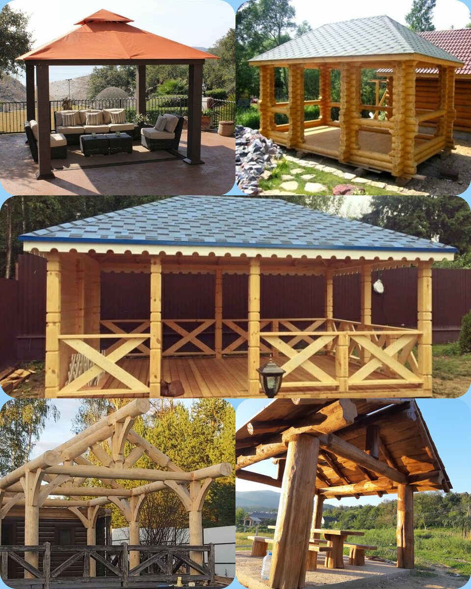 ольшая беседка для отдыха с семьёй и родными. Сделана из бруса 15×15 и доски 5×15.Основание под неё делают из бетона или бетонных колонн. Стропильная часть из доски 5×15 ,контррейки 3×5, (для металопрофиля обрешётка 3×10)(мягкая кровля фанера толщиной 1.5см). Вариант