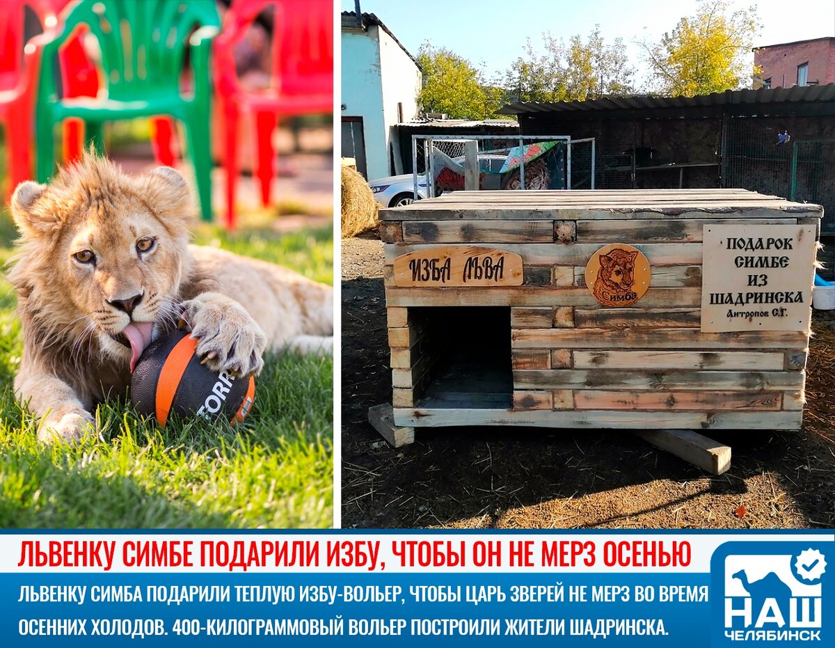 Львенку Симба, который живет в челябинском приюте «Спаси меня», подарили теплую избу-вольер, чтобы царь зверей не мерз во время осенних холодов. Вольер построили жители города Шадринск, а студенты Шадринского государственного педагогического университета доставили подарок в Челябинск. По их словам, «изба» весила порядка 400 кг.