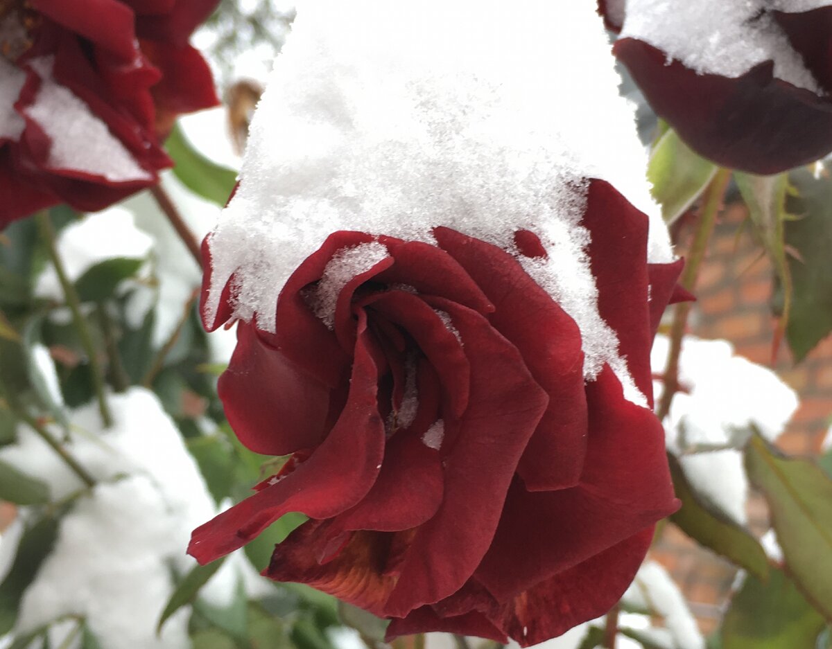 Миша не укрыл розы на зиму и они, цветущие, стояли под снегом.