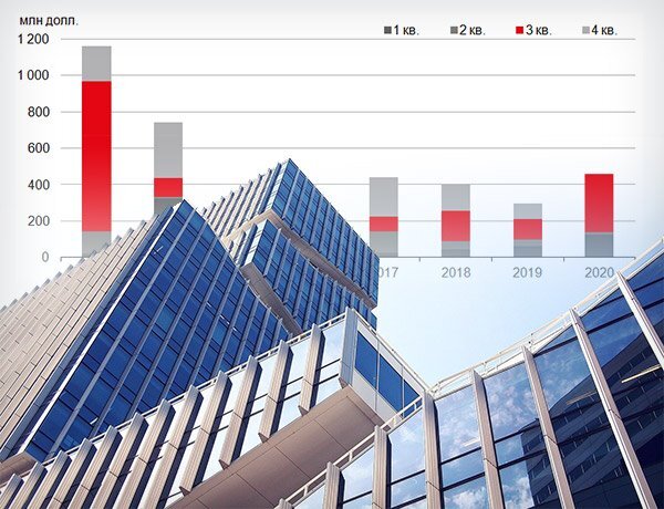 По оценке компании JLL, за девять месяцев 2020 года объем инвестиционных сделок на рынке недвижимости России составил 2,45 млрд долл., что лишь на 6% ниже результата аналогичного периода предыдущего года (2,6 млрд долл.). При этом показатель 3-го квартала оказался рекордным за последние четыре года, превысив на 18% объем соответствующего периода 2019 года: 1 121 млн долл. против 947 млн долл. соответственно.