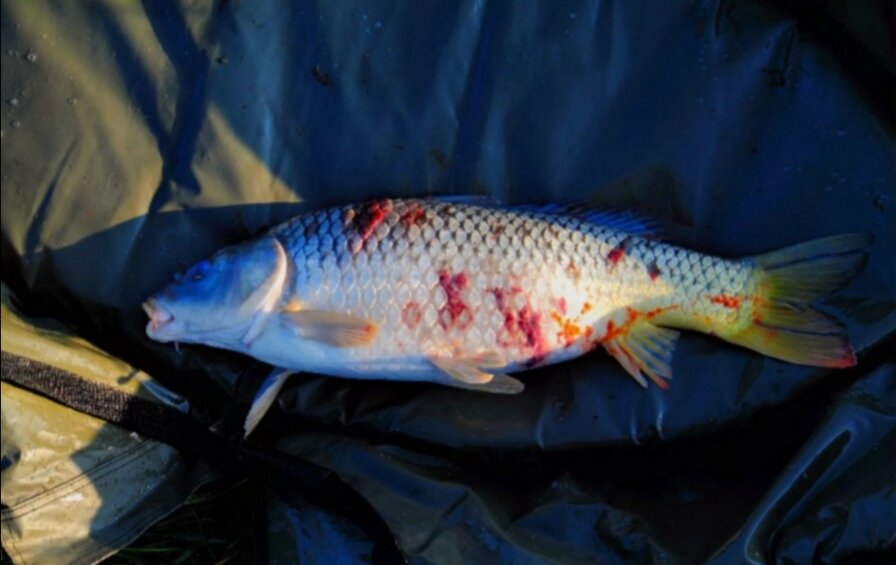 Поверхность тела и чешуя у больной рыбы - блеклые, а глаза, зачастую, мутноватые. Порой на поверхности тела больных рыб можно заметить бугры, куски кожи, язвы, рубцы, а при поражении инфузориями кожа рыб покрыта слизью, как голубой вуалью. Как правило, больные рыбы плавают медленно и вяло, чаще на боку или к верху брюхом. Очень часто они плавают вблизи берега, то пытаются опуститься вглубь, то вновь поднимаются на поверхность, то глотают воздух, то выполняют в толще воды хаотичные, похожие на круговые движения. Поймать подобных рыб голыми руками не составит труда. В водоемах, где вода загрязнена, недостаточно насыщена кислородом, содержит много микробных или паразитарных возбудителей, обнаруживается много погибшей рыбы на плесе или у берегов водоема.
