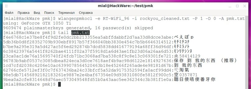Мы использовали программу wlangenpmkocl с опцией -a, что означает вывод plainmasterkeys в файл. У программы есть также опция -A, которая позволяет генерировать файл со строками вида plainmasterkey:ПАРОЛЬ. Создадим такой файл:
