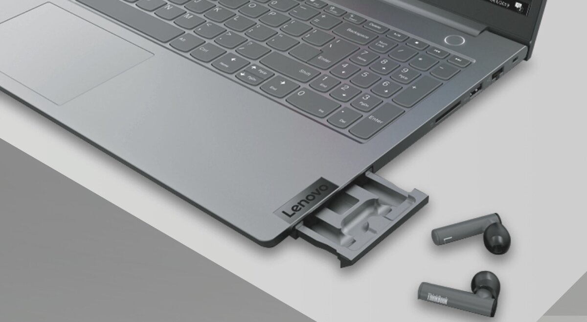 Модель ThinkBook 15 Gen2 действительно получила лоток для наушников, он расположен справа. Сами наушники с силиконовыми амбушюрами и автоматически подключаются к ноутбуку, как только вы их вынимаете. Управление сенсорное, есть система шумоподавления, зарядка только через встроенный в ноутбук лоток — дополнительного кейса для использования наушников отдельно от ноутбука не предусмотрено.