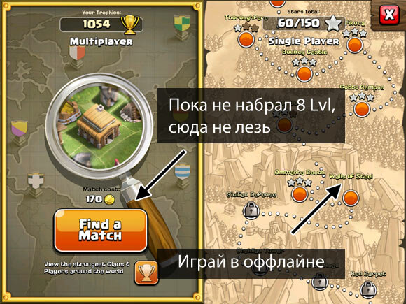 Многие игроки с началом игровой карьеры тут же вылезают в мультплеер. Не делай этого, пока твое развитие не перешагнет 8 Lvl. В противном случае более сильные игроки разнесут твою базу в пух и прах. До восьмого уровня играй в “оффлайн-песочнице”, сражаясь против гоблинов и зарабатывая валюту для апгрейдов своего лагеря. После восьмого уровня нажимай на Attack -> Find a Match. Тут начинается самое интересное.