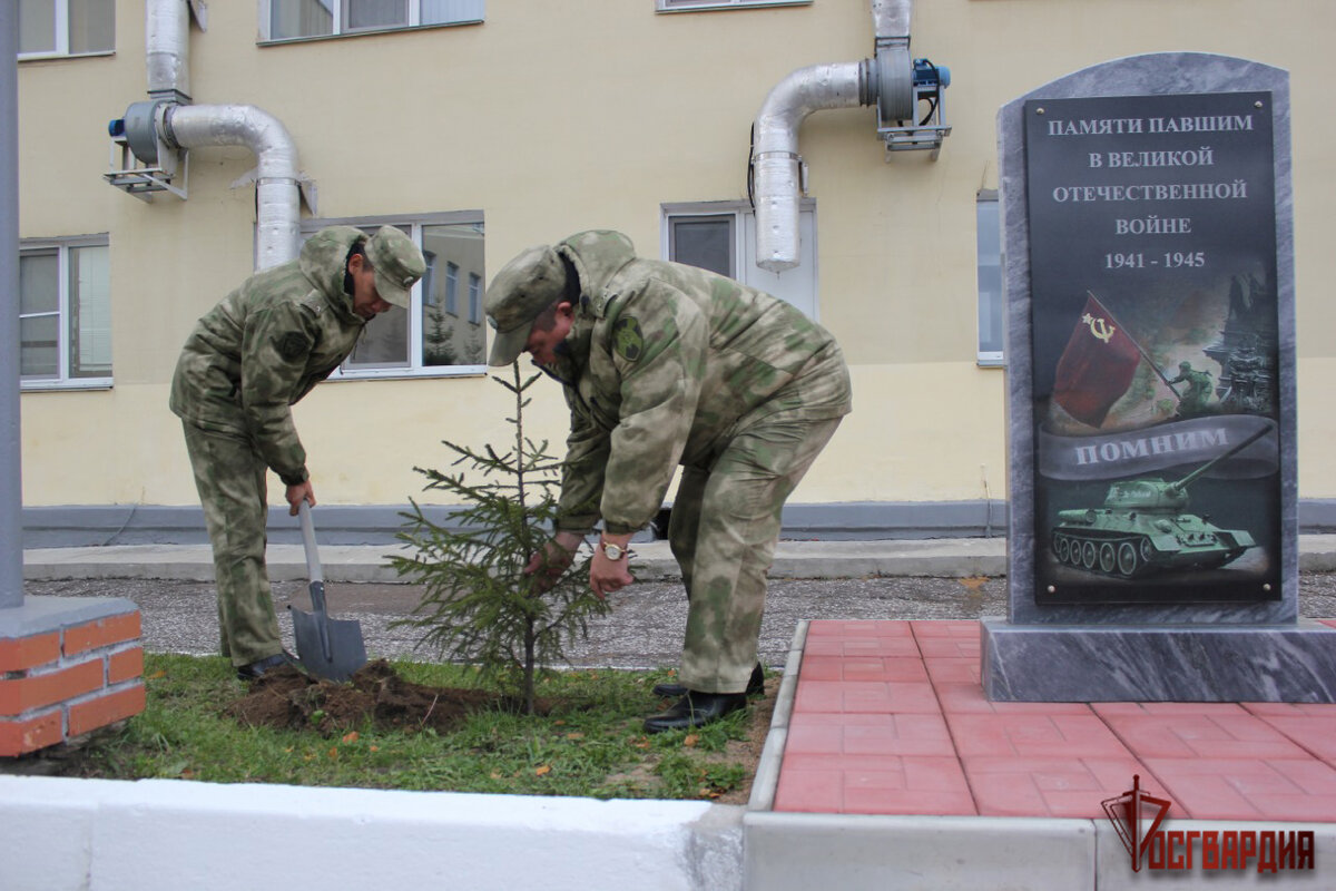В посадке молодых деревьев на территории воинской части у мемориала «Связь трёх поколений» принял участие командир центра подготовки личного состава Росгвардии