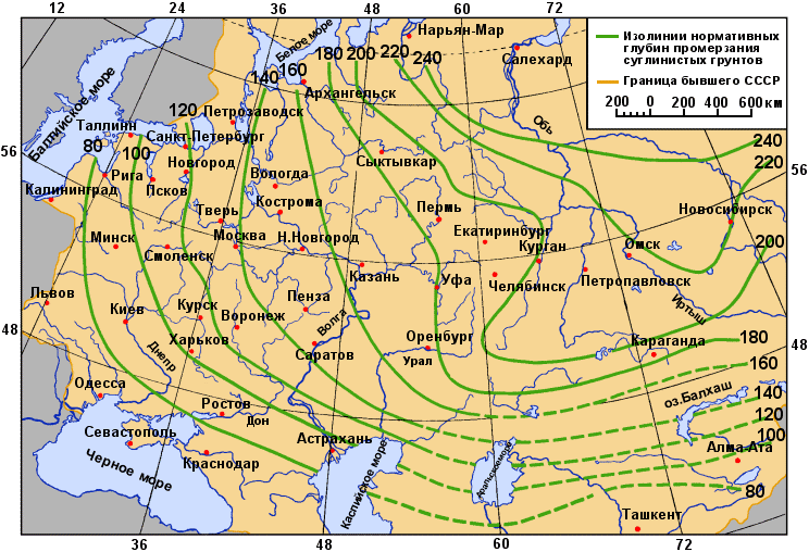 Возьмём Москву- 140 см. Подошва фундамента должна залегать ниже глубины промерзания грунта на 15 см. 140+15=155 см. Кроме того, котлован под фундамент необходимо выкопать ещё глубже для устройство песчаной подушки толщиной 15 см. 155+15=170 см.