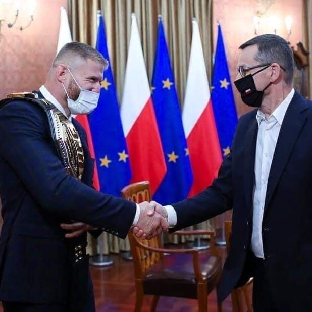 Новоиспечённый чемпион UFC в полутяжёлом весе Ян Блахович встретился с премьер-министром Польши Матеушом Моравецким. «Большое спасибо за приглашение от премьер-министра Матеуша Моравецкого. И для меня, и для всего ММА-сообщества это доказывает, что наша дисциплина не только популярна, но и заметна для самых важных людей в Польше. Для меня большая честь быть послом этого удивительного спорта. Надеюсь, после нашего разговора премьер-министр вне зависимости от времени будет ждать перед телевизором, чтобы посмотреть мой следующий бой», — написал в своём «инстаграме» Блахович. Напомним, ранним утром 27 сентября по московскому времени Ян Блахович нокаутировал Доминика Рейеса и завоевал вакантный титул чемпиона UFC в полутяжёлом весе. Пояс принадлежал Джонсу. Регалия стала вакантной после того, как Джон объявил о переходе в тяжёлый вес. Американец по-прежнему не провёл в новом дивизионе ни одного поединка.