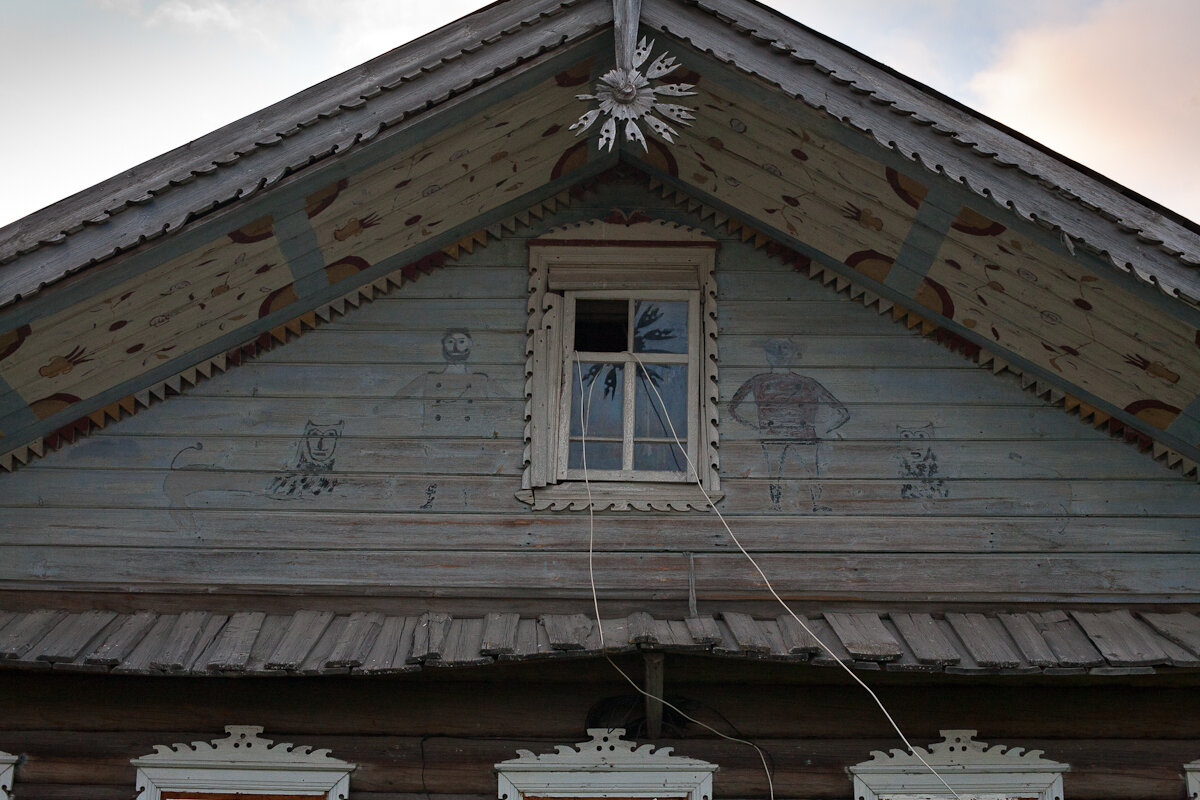 ...Очередной поворот грунтовки и этот километровый столбик с цифрами на синем фоне. В Архангельской области он как правило двухзначный. Так и сейчас, до деревни Ступинской в Няндомском районе, где находятся несколько расписных домов чуть более 50 километров. Грунтовка в целом не сильно плохая, местами серпантинистая, но вознаграждает путника прекрасными видами северной тайги. И вот, наконец, мы заезжаем в деревню. Здесь должно быть два расписных дома. Находим их сразу, они в самом центре деревни. У одного из них мужичок в клетчатой рубахе, жилетке и шапочке снимает москитную сетку с окна. Да, окошко уже пластиковое, но такова реальность. Все же зимой тепло лишним не бывает. Роспись на доме интересная, на фронтоне изображены два мужика в кафтанах и чудо львы по бокам. Один из мужичков бородат, а второй брит, но с трубкой в зубах. На свесе крыши цветы в горшках. В целом композиция позитивная, и не смотря на выцветшую краску, довольно яркая.