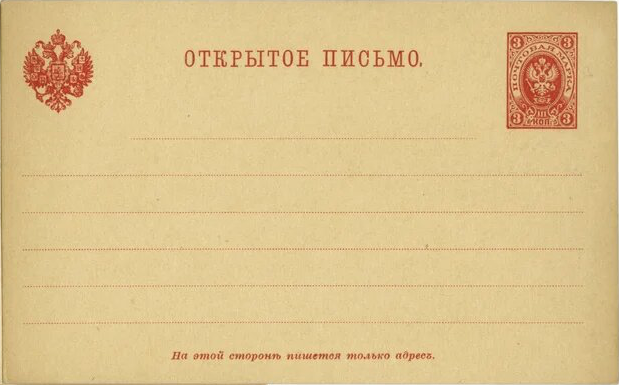 По своей сути открытка – это вид почтовой карточки для отправления открытого письма (отсюда и само слово «открытка»). В России первая открытка появилась 1 января 1872 года. На лицевой стороне размещались эмблема почтового ведомства, место для марки и надпись о недопустимости писать что-либо кроме адреса. Само письмо писали на другой стороне.