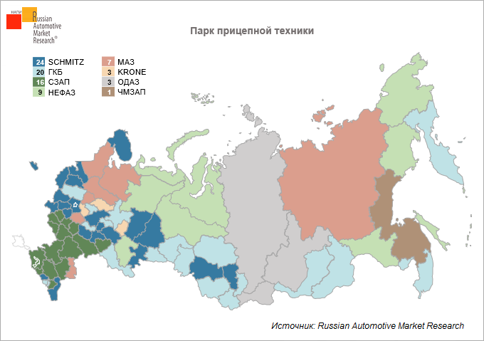 Наибольшей популярностью в 24 регионах России, включая Москву и Санкт-Петербург, пользуются немецкие прицепы SCHMITZ. Прицепы SCHMITZ – самые многочисленные в парке: 116,0 тыс. ед. или 11%.